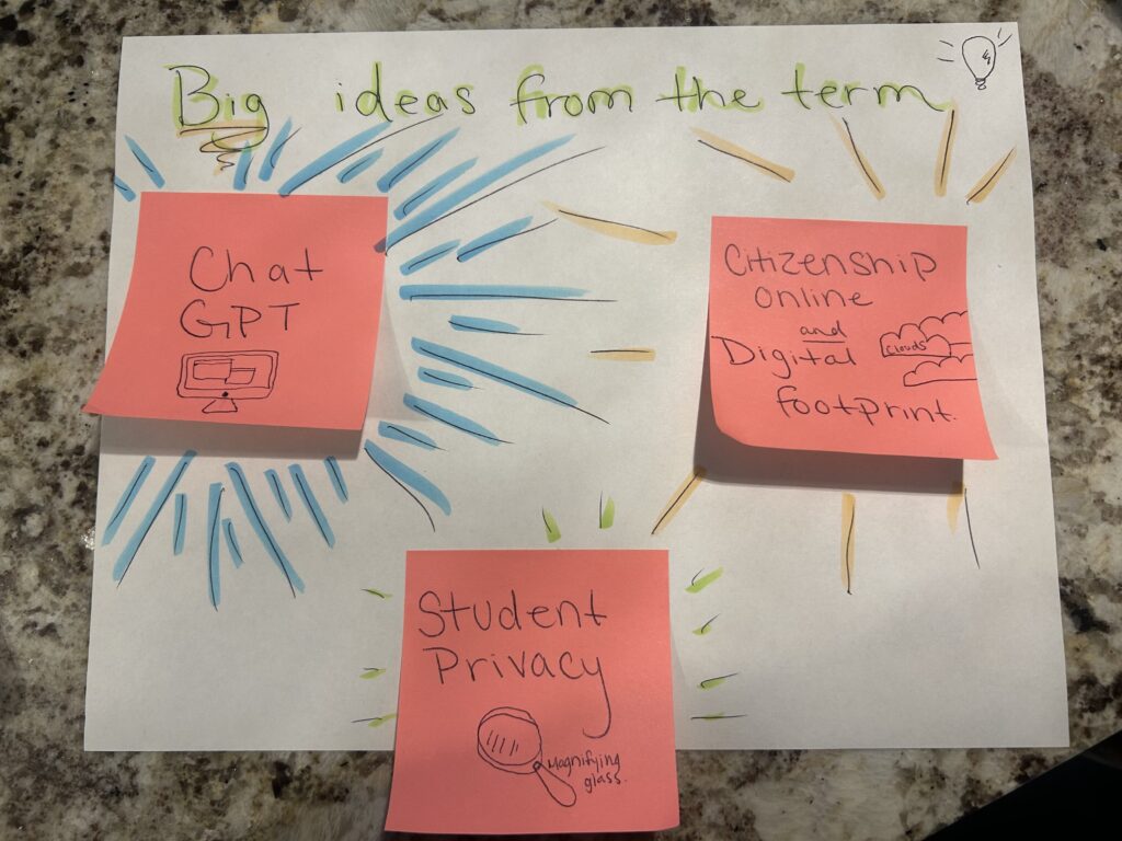 Below is my sketchnote I made of the big ideas I mentioned above. As you can see, Chat GPT has the biggest fireworks, indicating that it has been the biggest tool for me, and then my digital footprint and student privacy.